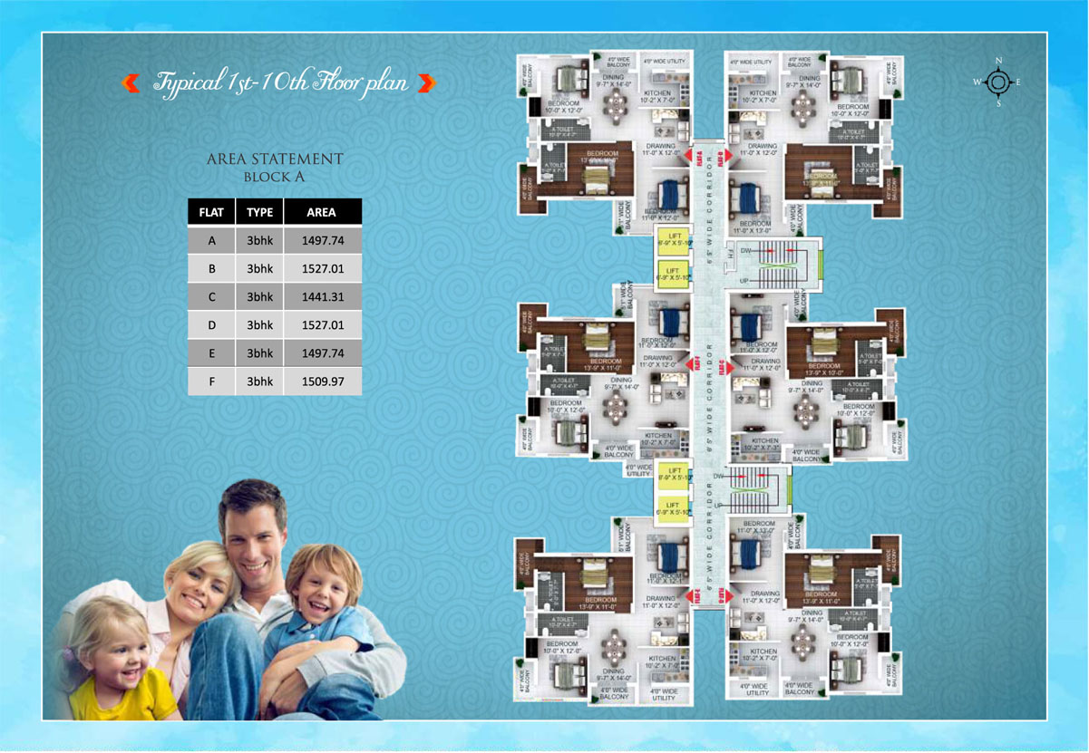Bedroom & Kitchen - Vitrified Tiles. Toilet - Anti skid ceramic tiles. COMMON AREAS - Granite